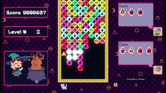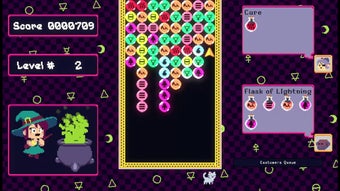 502's Arcade includes four games with unique gameplay mechanics. Ghost Hunter Hana involves sealing bosses and bad spirits through melee and ranged combat. Potions Panic is a game where you match at least four similarly colored orbs to concoct potions for customers, fusing skill and luck.